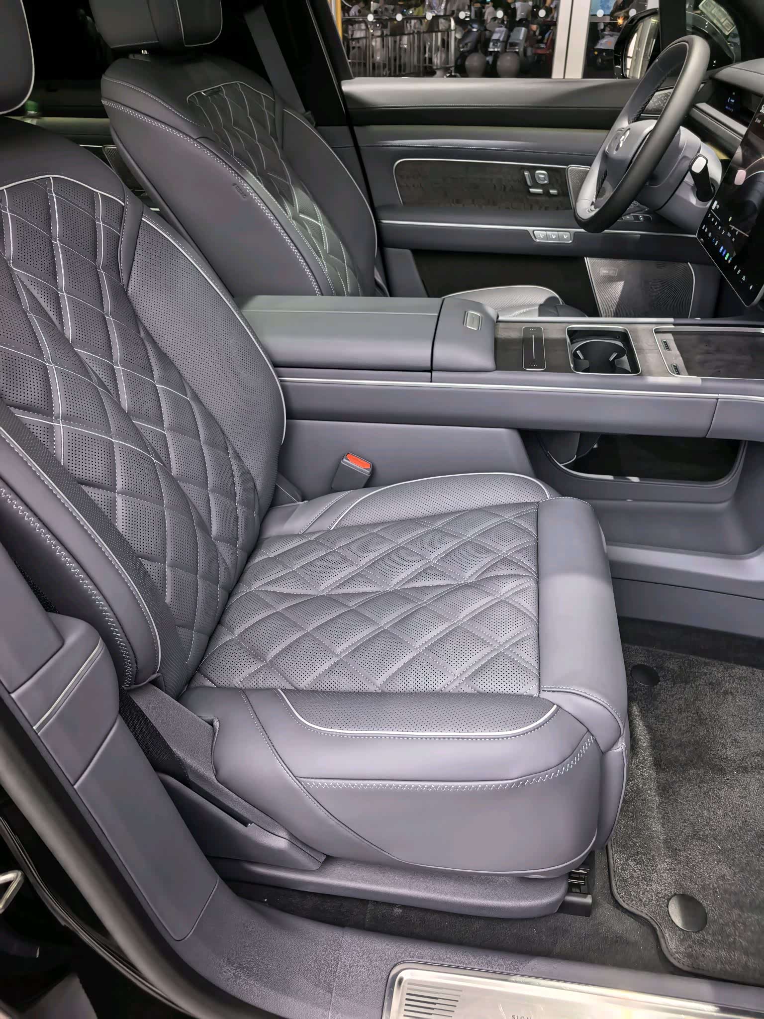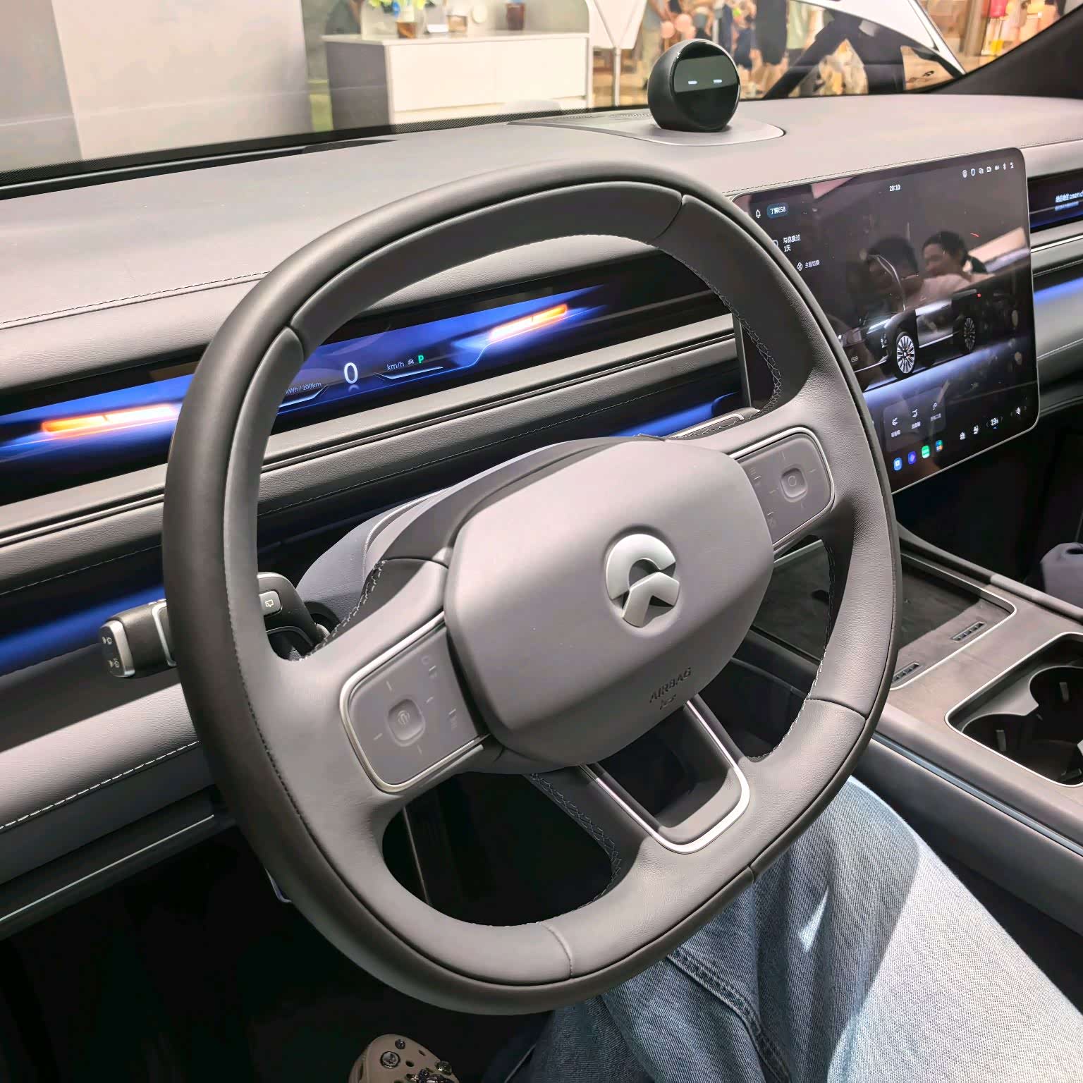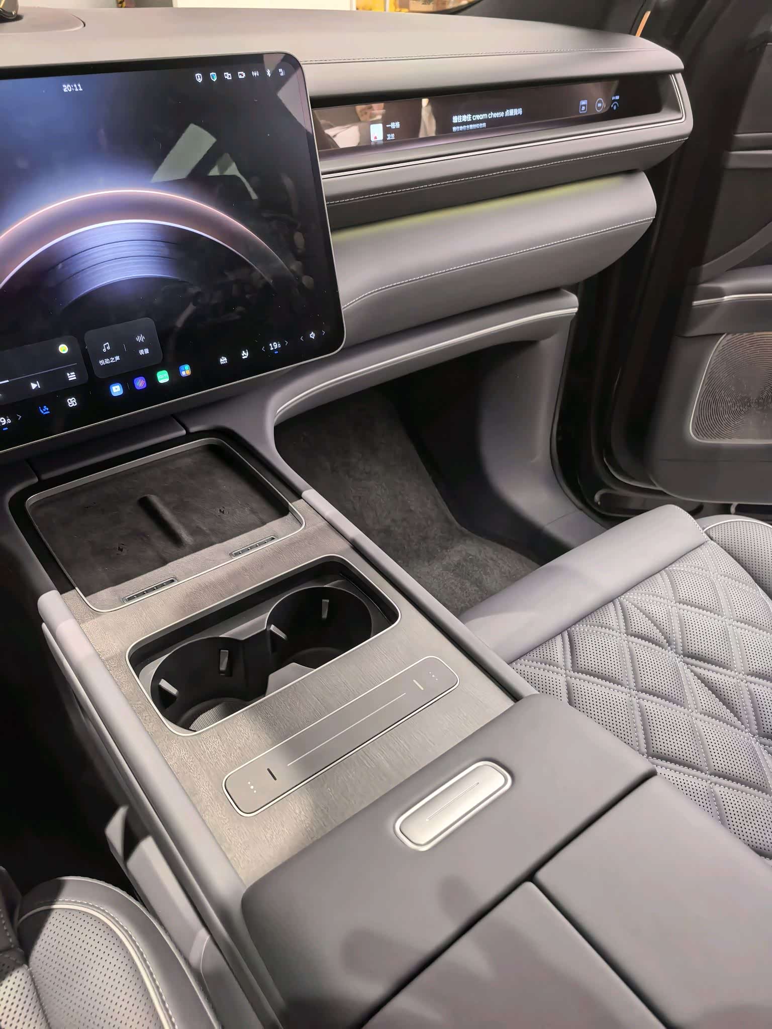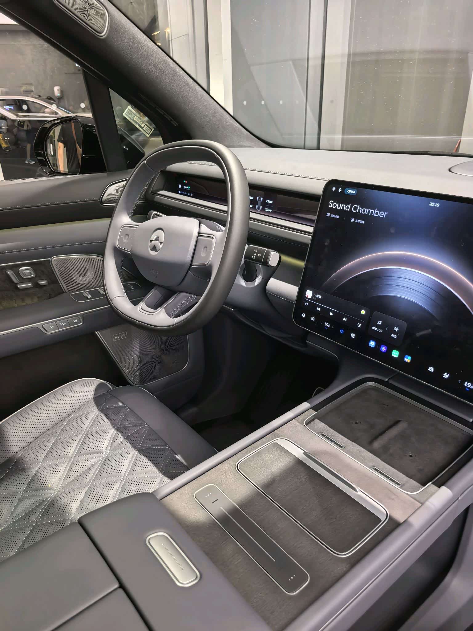 车内豪华感比老款明显提升了一个档次。大面积软性材质包裹,Nappa真皮座椅,质感确实对得起旗舰定位。销售说ES8整个车内软包面积有50多平方米!中控变成了高清3K横置大屏,显示效果细腻。