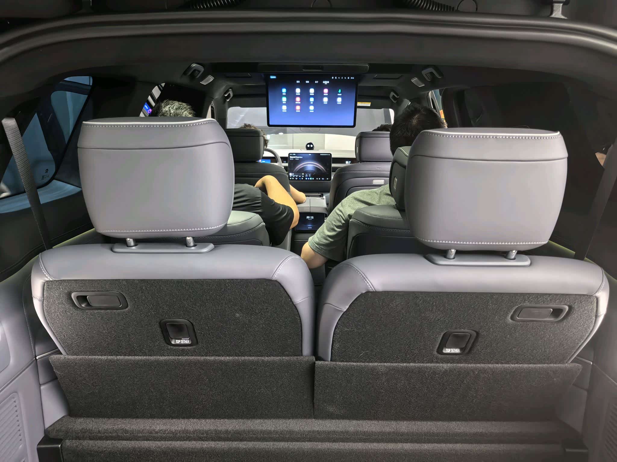 副驾和第二排两个座位都标配零重力座椅,这是同级唯一的都免费给的。座椅功能集成在门板上和二排中控上,操作很方便。中间过道足够宽,进第三排也比较从容。
