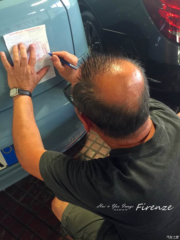 办理还车手续。相当简便,验车的大姐,围着小车转一圈,直接填单子,OK!