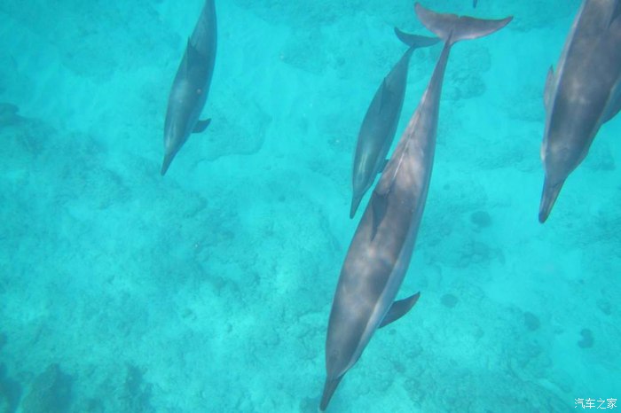 这天天气出奇的好,第一次坐在快艇的船头,感受400M的水深,第一次看到海豚时的心跳,他们真是太可爱了。由于有浪,海豚追浪的速度比我们追它的速度还快。