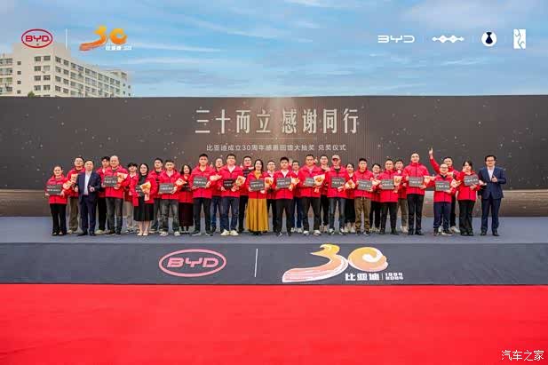 11月23日,比亚迪成立30周年感恩回馈大抽奖活动的兑奖仪式,在比亚迪全球总部隆重举行。比亚迪股份有限公司董事长兼总裁王传福现场向60位幸运车主和30位幸运员工分别交付30台仰望U8、30台腾势Z9GT和30台方程豹豹8的使用权,表达了对用户与员工的感谢之情。