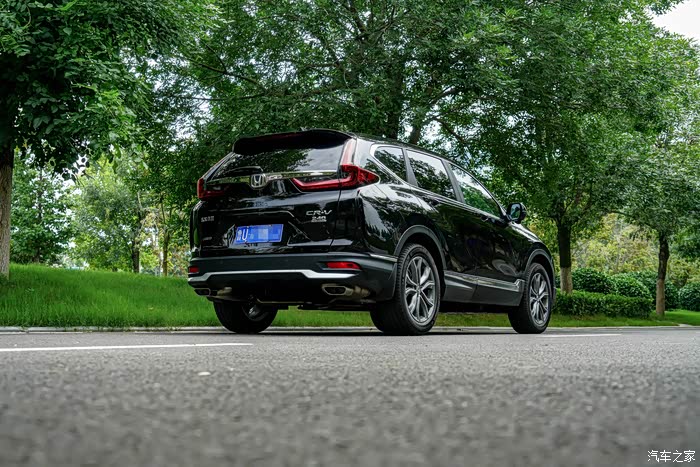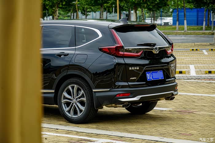 第一眼看到朋友的新CR-V,感觉新款年轻了不少,特别是这个黑色的版本,还挺有范,前面的LED大灯很漂亮,下面新增加了一个银色的小八字胡的包围,还挺提气。然后侧面这个19英寸的轮毂确实是好看,尺寸很大,一下子就让车的档次提升了上去,之前在路上经常看16、17寸轮毂的老款CR-V,总觉得差点意思。车尾的大灯改成了熏黑的样式,也是提升年轻化很重要的一点,然后下面排气管改成了扁平的设计,我记得之前是圆的。