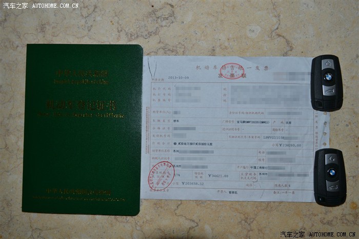 买车提车的经过就不多说了,满满的都是泪,屌丝买宝马的经历也能更好的看清我朝这种浮夸的风气,从5月份开始就到处打听,基本上问遍了江浙沪地区所有的4S,大多不爱接手动丐中丐这样的订单,要么是给你个夸张的价格,要么直接是跟你说没这个车,本地有一家宝马5S,不点名道姓了,销售冷淡的态度在LD多次电话的催促下居然答曰:“今年内都没有你要的这个车了”,好在宝马的销售政策没有大众那么变态,华东地区都是可以异地提车的,最后在LD的努力下终于找到苏州一家靠谱的4S,以8个点的价格下订,除了保险在店里买,其他没有任何费用,店里各种手续还算正规,销售MM人也不错,及时告知了车架号,下线时间等信息,其间错过了一辆白色,因为我不想要普通漆,最后10月9号去提了车,马屎棕,新车9KM的里程,简简单单没有鲜花红绳,也没什么礼物,除了大家都有的U盘和钥匙扣,全款购车,上保险,交了100块钱临牌手续费就开走了,当天回本地的税务交购置税,车管所上牌,非常顺利,只是由于网上自选牌照,铁皮过了10天才拿到,行驶证环保标什么的当天就办好的。