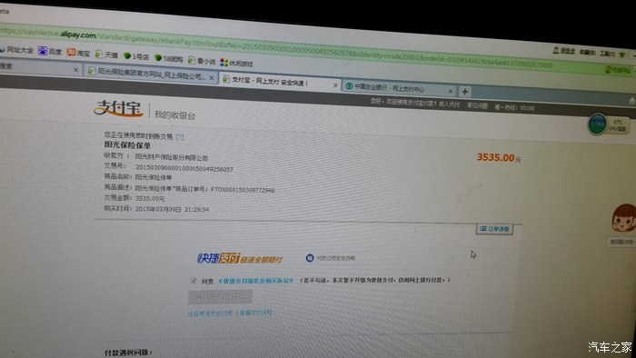 对了最后在上张前几天网上买的车险照片,另跟宏友们交流下网上车险我买的全保《三者50万,车损,不计免赔》又加一个100块的人身意外险保15万一起是3535块。另送了400块油卡,一百块话费,我是第二年第一年没出过险,另外告诉大家买的时候多比较几家大的保险公司,跟他们多争取点东西!