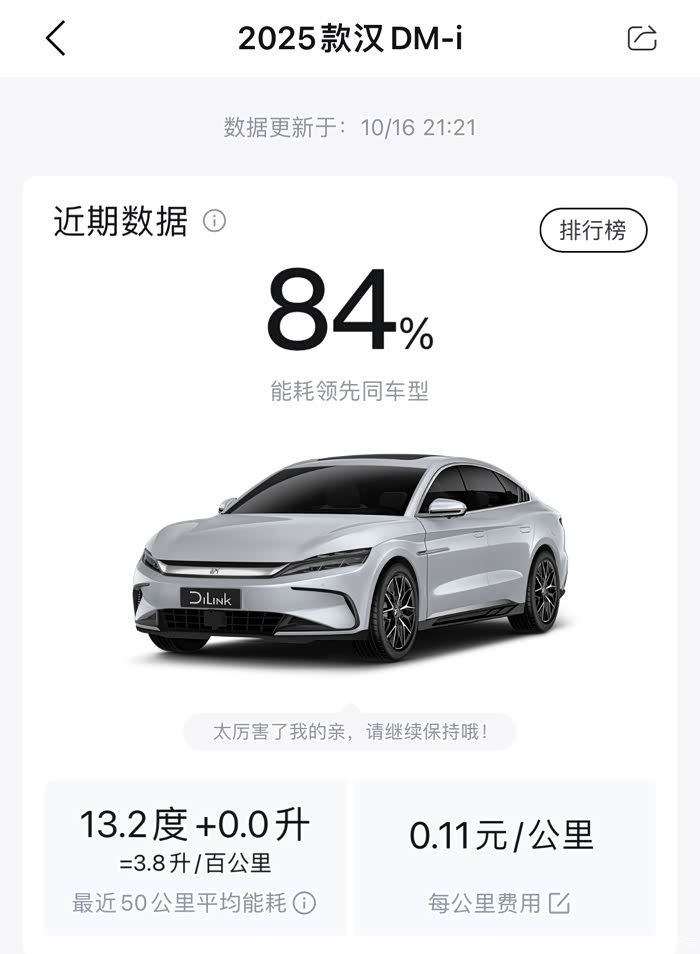 简单的说说感受吧,开了一周,因为租的车位无法安装充电桩,外面的慢充充电桩上冲过了2次电。全程混动模式开,目前车机显示近50km平均油耗3.8,这一礼拜开的不算温柔,也是想感受车子的驾驶感受,急加速,超车动力澎湃,主要路况是城区+快速内环高架,综合下来4.5L百公里。平顺,一个字平顺,提速快。家用车达到这个标准我觉得就是满意的。最后附:油耗分享。