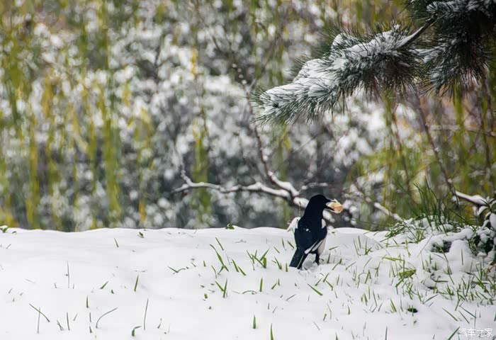深秋的绿色 还不愿意退去 第一场雪 悄然而来 一只喜鹊貌似在欣赏,貌似在寻觅