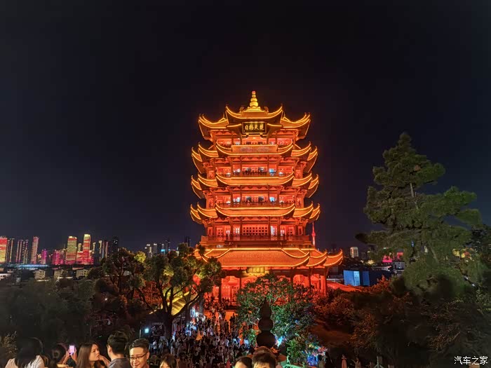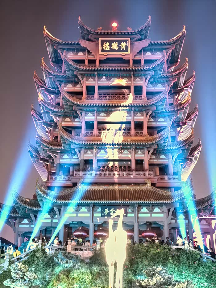 7月20日,第一天,赶点路,早上8点半出发,下午6点半到武汉,住下,吃饭,原以为黄鹤楼晚上不开,去看看外围,谁知开放到晚上10点半,赶巧了,就是门票贵了点,150元/人。黄鹤楼位于湖北省武汉市长江南岸的武昌蛇山峰岭之上,为国家5A级旅游景区,享有"天下江山第一楼"、"天下绝景"之称。黄鹤楼是武汉市标志性建筑,与晴川阁、古琴台并称武汉三大名胜。黄鹤楼始建于三国时代吴黄武二年(公元223年)。唐代著名诗人崔颢在此题下《黄鹤楼》一诗,使它闻名遐迩。黄鹤楼坐落在海拔61.7米的蛇山顶,京广铁路的列车从楼下呼啸而过。楼高5层,总高度51.4米,建筑面积3219平方米。黄鹤楼内部由72根圆柱支撑,外部有60个翘角向外伸展,屋面用10多万块黄色琉璃瓦覆盖构建而成。黄鹤楼楼外铸铜黄鹤造型、胜像宝塔、牌坊、轩廊、亭阁等一批辅助建筑,将主楼烘托得更加壮丽。主楼周围还建有白云阁、象宝塔、碑廊、山门等建筑。整个建筑具有独特的民族风格,与蛇山脚下的武汉长江大桥交相辉映;登楼远眺,武汉三镇的风光尽收眼底。