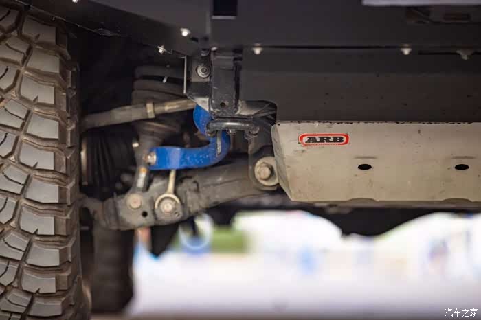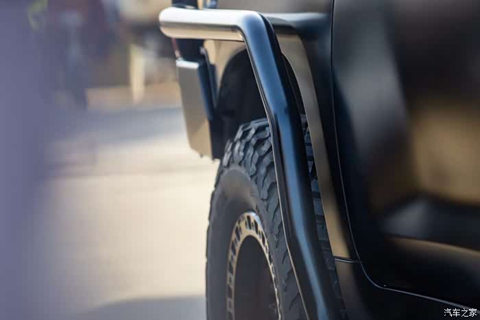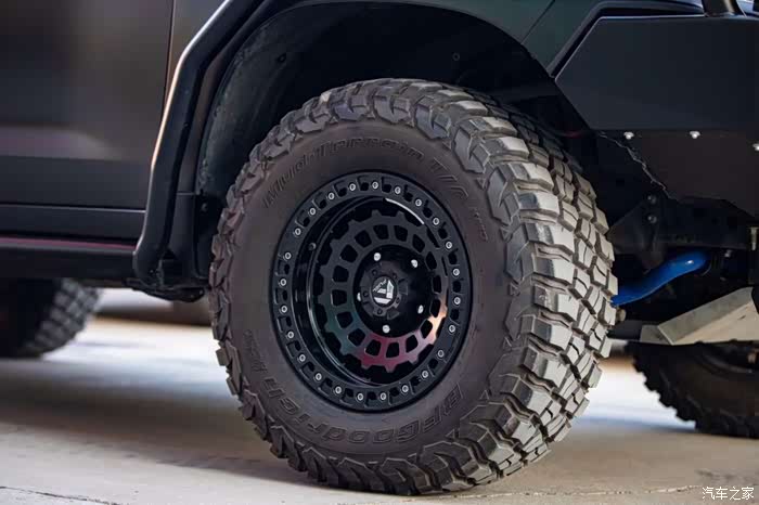 轮胎更换了百路驰最新的KM3泥地胎,相较老款KM2,有着更强壮的胎壁、更出色的岩石和泥地牵引力,以及更优秀的公路行驶表现;285/70/R17的尺寸比原厂直径大了3公分左右,并不会过多破坏原车平衡。