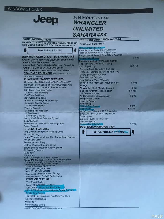 Jeep销售给我的四门版Sahara牧马人报价,销售告诉我加上税以后可以给我优惠到4万1千美金