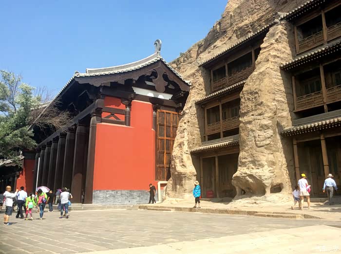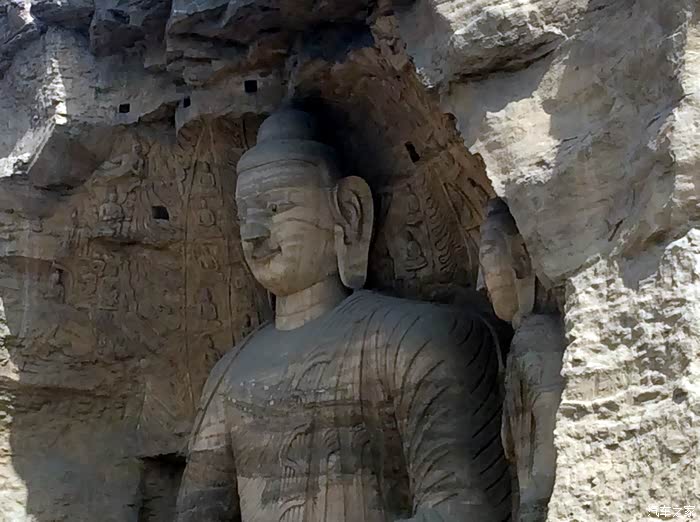 进入景区第一眼就看到了一尊雕像,他是云冈石窟最初开凿的推动、组织、经营者名字叫昙曜。查阅资料后发现居然是我老乡,我老乡很牛哦!绕过雕像之后还需要穿过三座寺院。也可以乘船到达石窟入口。云冈石窟到今天已经历经了1500年的沧桑巨变,以及自然风化和人为破坏,致使洞窟及雕像有不同程度的损毁。新中国成立之后政府进行了多次修复性保护,所以有些石窟是全封闭的,不提供游客参观。
