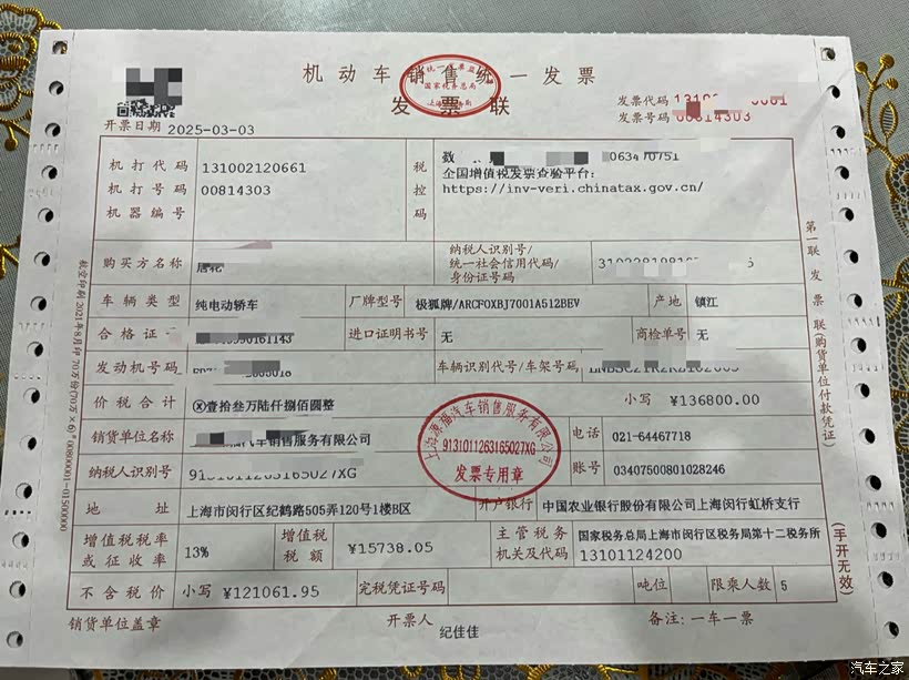 我买的是2024款阿尔法S5 560MAX,这款车官方指导价是17.68万元,刚好赶上开年厂家推出的优惠活动,有3.2万元的现金优惠,再叠加8000元的购车补贴,折算下来裸车价就是13.68万元,这个价格在同级别纯电轿车里性价比相当能打。保险方面,我选了人保的全险,包含交强险、车损险以及200万保额的第三者责任险,全套下来花费0.53万元。上牌费是自己去车管所办理的,花了310元,没有其他强制加装或服务费,最终落地价刚好14.21万元。这笔钱是我攒了三年多的工资,一次性付清没有车贷,不用承担利息,也不会给每月工资带来还款压力,这也是我选择全款的核心原因——不想因为买车降低生活质量。