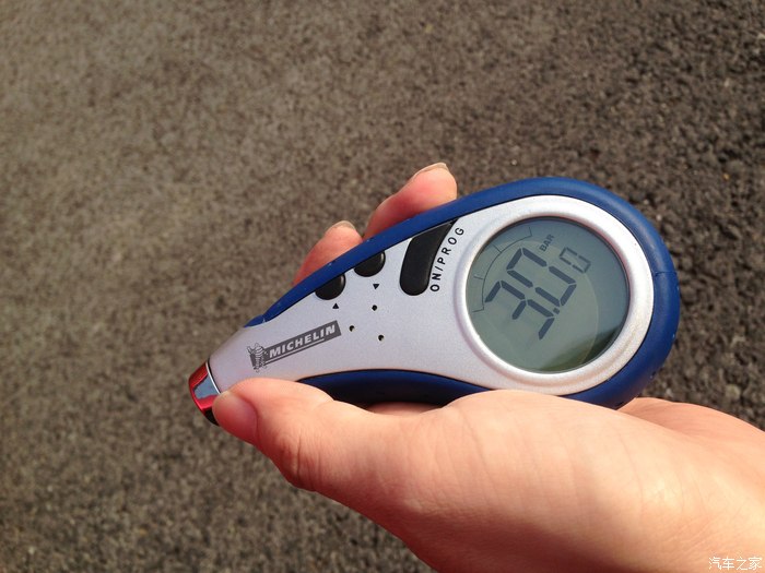一试下来,吓我一跳:四个轮胎都是3.0bar以上的胎压;难怪过坑整个车梆梆作响(尼玛,提车前4S店的人根本没测胎压也没调节,真是不够水准