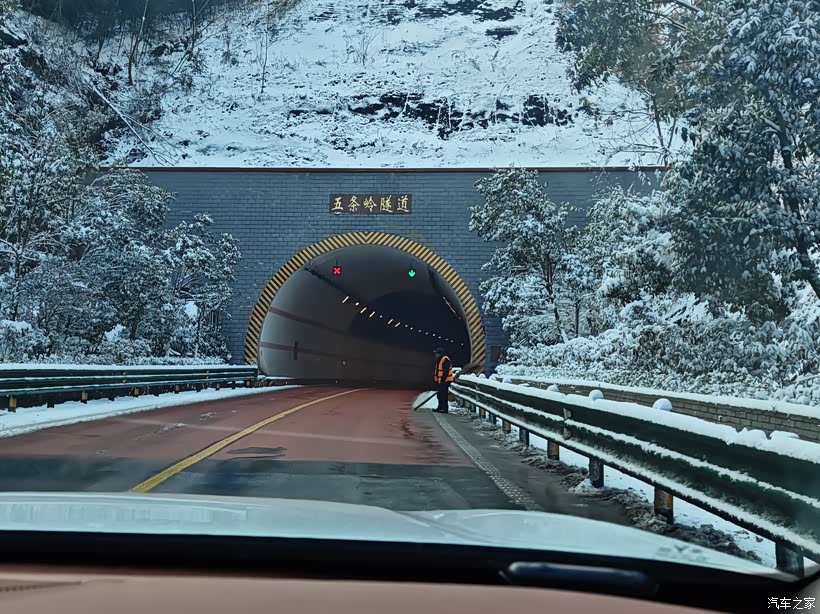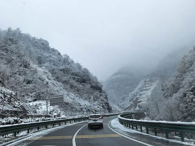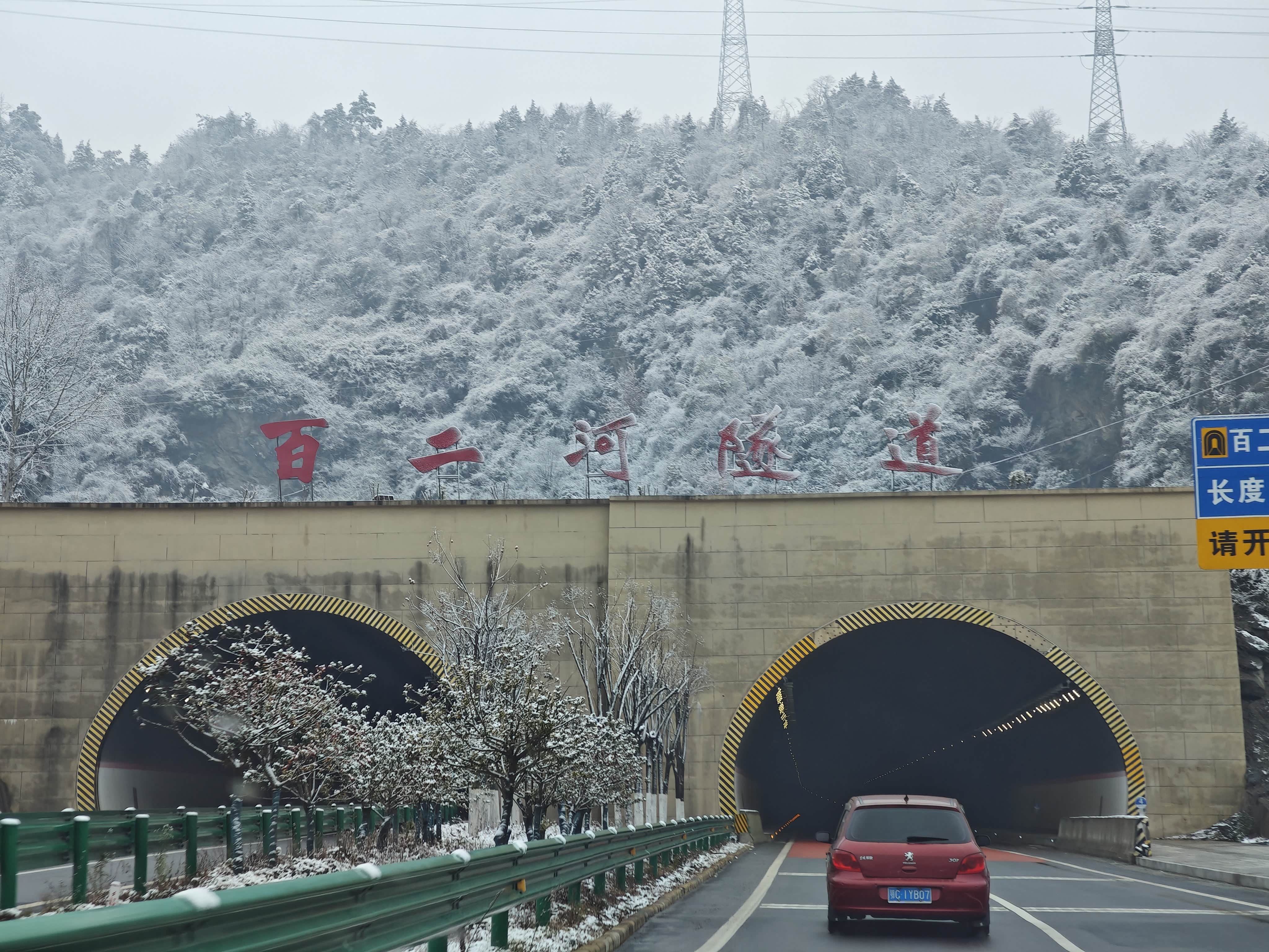 穿过“百二河”隧道,仿佛穿越到了冰雪世界一样,隧道的另一边,除了路面比较干燥以外,路边满是积雪,两边的山坡树林,白茫茫一片,仿若真实的冰雪世界。