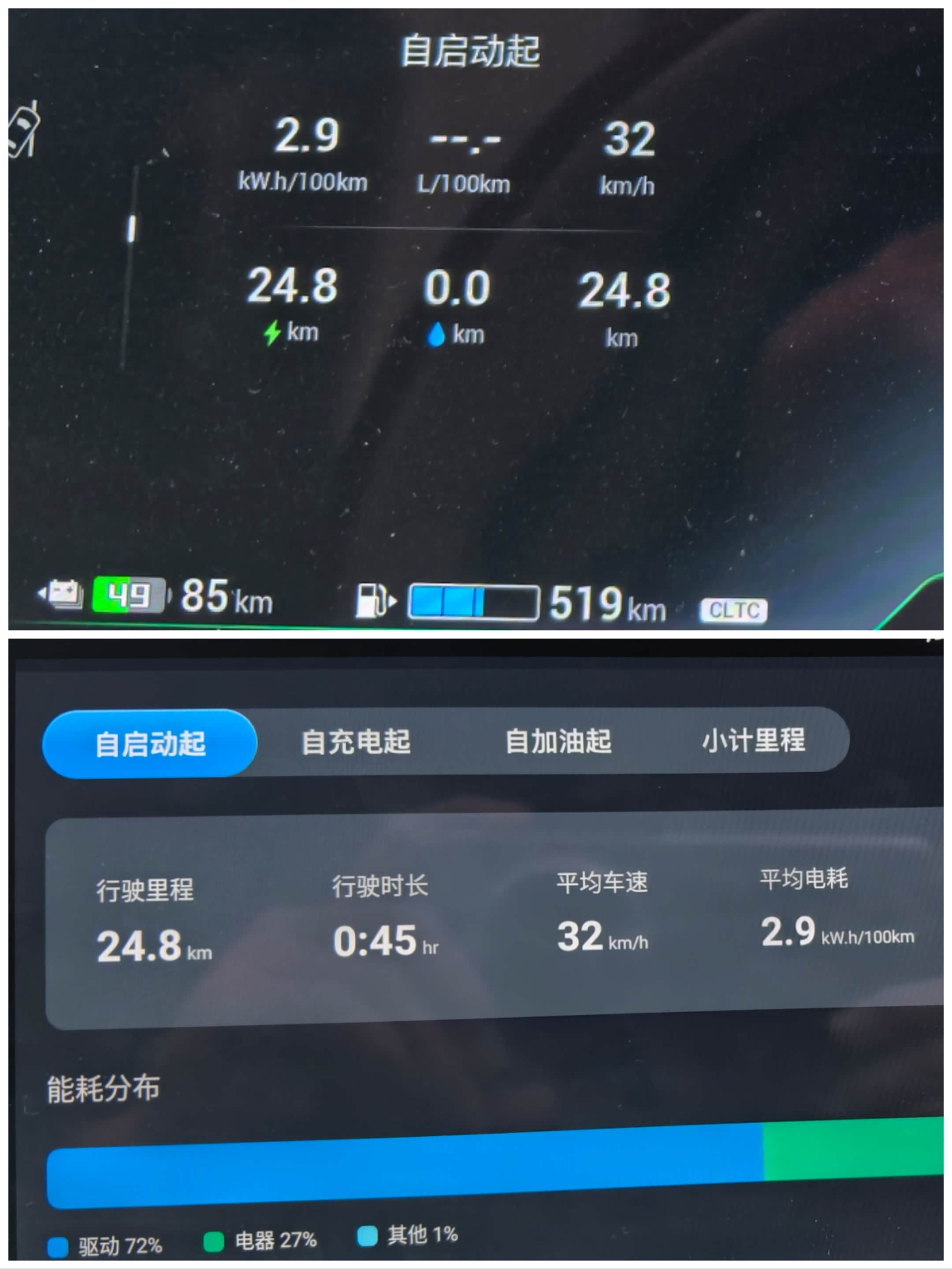 行驶距离:24.8km,平均能耗2.9kWh/100km(因为返程是从山上回市区,下坡路段较多),平均时速32km/h