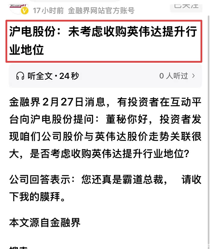 今天看到沪电股份的投资者提问,发现公司股价跟英伟达股价走势关联很大,是否考虑收购英伟达提升行业地位?沪电股份回复,您还真是霸道总裁,请收下我的膜拜。