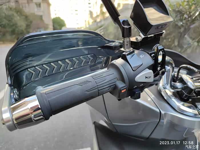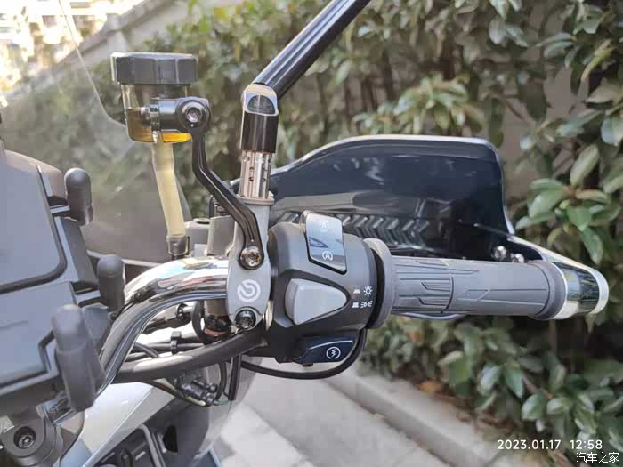 大冬天的,觉得加热手柄是摩托舒适配置第一位,不会像其他厚重装备那样降低操控性,同时装个护手(过了冬天就拆了),像这样冬天我就一副薄棉手套就OK了,且橡胶热一些摩擦力会比冰冷时好很多。