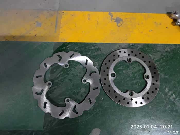 ②刹车盘。原盘220的不能用了,转接码只对应240的。卖转接码那家有泰国产的,不过不便宜还要等泰国发货……实际上不必专用的盘(省钱),本田4孔240,PCD(对角孔距)125的后盘都可以通用,CB啥的很多,便宜又好看;
