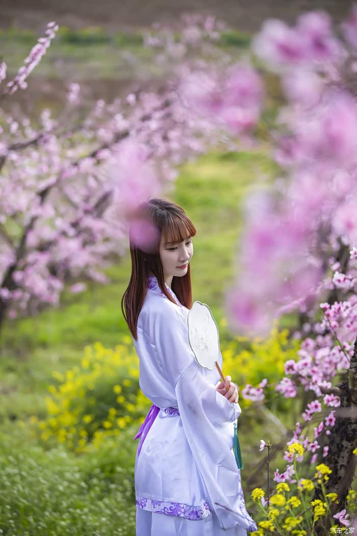 几只小鸟也桃花中嬉戏,它们是春天纯真的笔调。