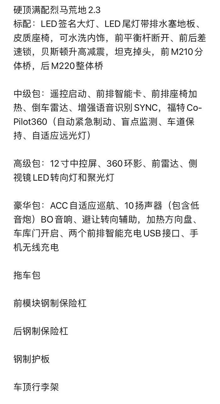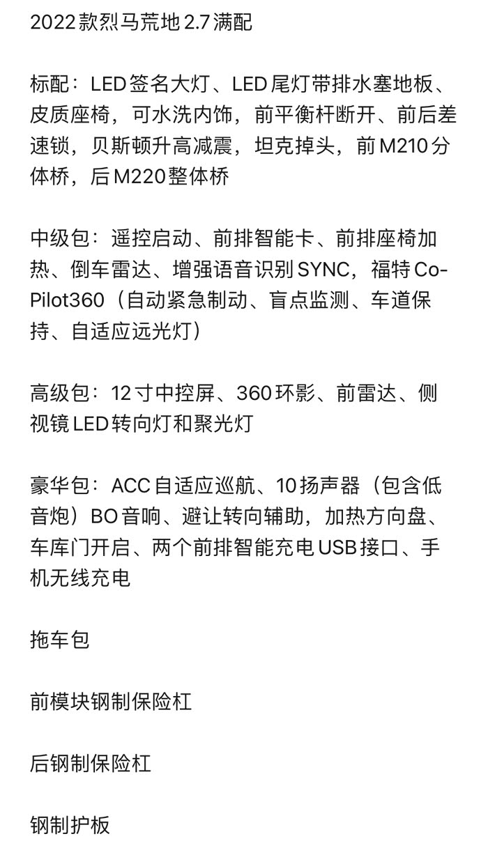 以下这个配置属于荒地版满配,科技配置选满(中级包,高级包,豪华包全部带有)虽然没有选择电动座椅,但原厂就采用了乙烯基皮质的防水座椅,保证了在越野涉水的时候更低的故障率。原车配备的是LT285/70R17的百路驰33寸轮胎,但速比是4.46而且同样采用了和选装大脚包车型一样的贝斯登升高减震,所以按照福特官方数据可以无损更换35寸轮胎(315/70R17)所以说喜欢大脚的话只需到手后期升级即可