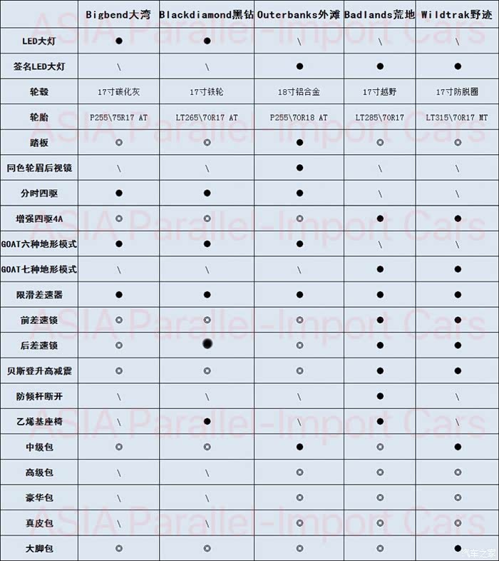 上文已介绍荒地定位极限越野,而wildtrak野迹官方定位高速越野,该版本标配sasquatch大脚包,全车暗夜套件(中网,轮毂,尾标)颜值也是众多版本中最高的。出厂即巅峰,如果预算充足,喜欢自驾穿越,城市通勤那野迹版真的是无可挑剔。颜值和能力并存的版本