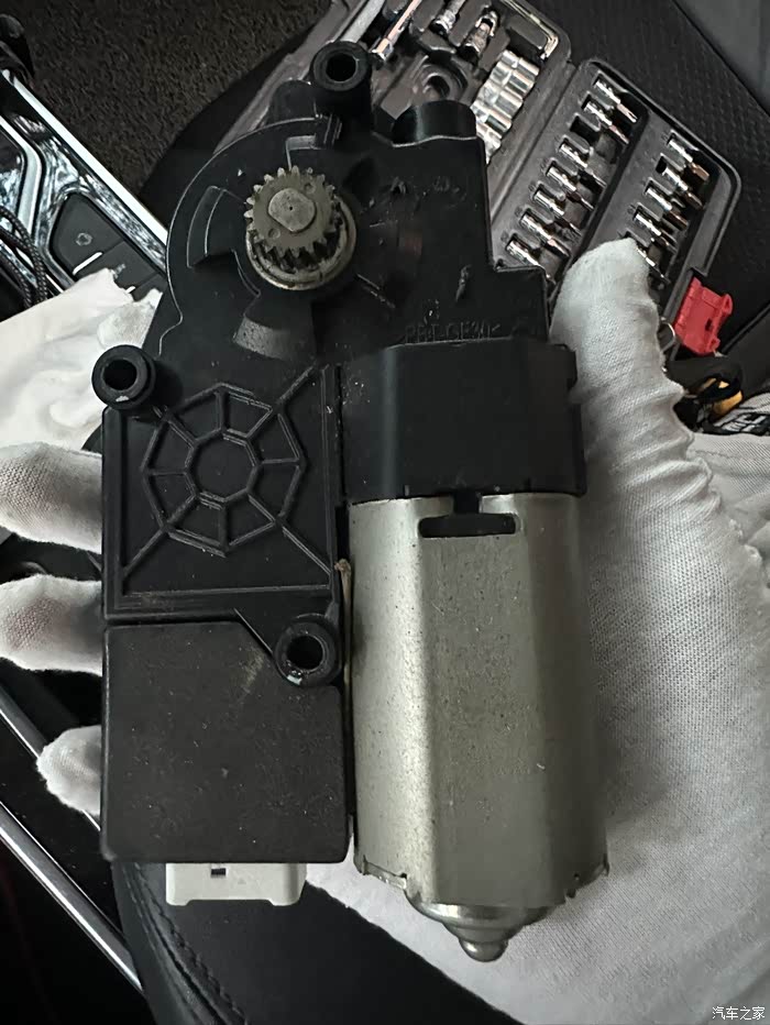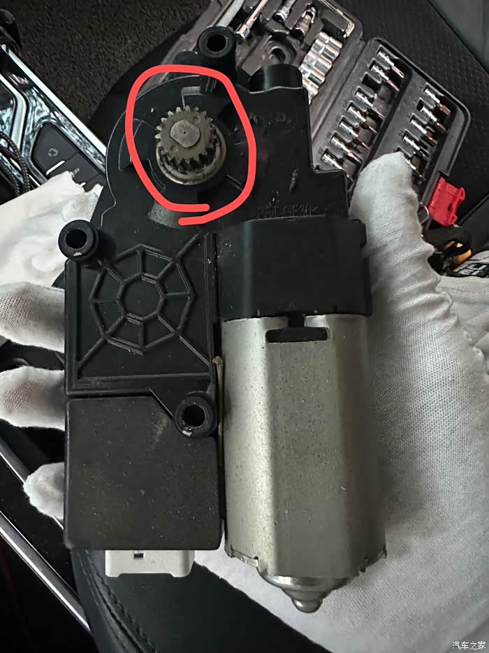 电机拆下来后发现传动齿轮⚙️有很明显的磨损痕迹,这样导致复位过程中滑齿出现咔咔咔的声音最终复位失败使天窗失去自动控制功能