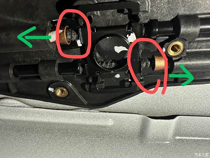 找一个尖嘴钳子夹住红圈圈中的位置的钢丝绳向剪头方向拉几毫米,要注意两个钢丝绳要同步拉伸。然后再把天窗电机装上,关闭天窗后看看是否跟车顶一平,如果还是凹下去就要重复这个步骤再来一次,如果突起来了就要把钢丝绳向图中绿色箭头的相反方向拉伸,切记一次调整几毫米即可不要调整过多。如果右侧的天窗比左侧关闭后更凹进去,就要把单独右侧的钢丝绳向剪头方向拉伸几毫米。