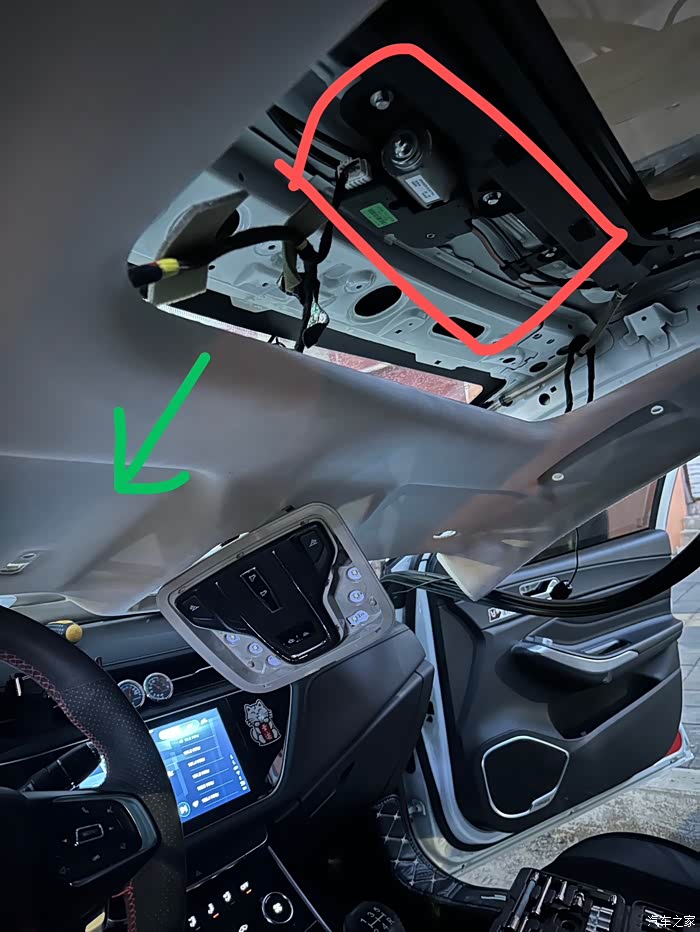 拆下来顶棚后将顶棚整体往前一拉就能看见车顶的天窗电机和传动结构了