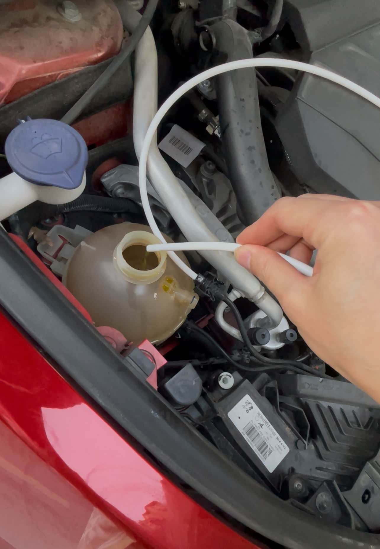❶车子启动,用一个二分管接到防冻液水壶上的上回水口管子上,另一头接到防冻液上水壶口。