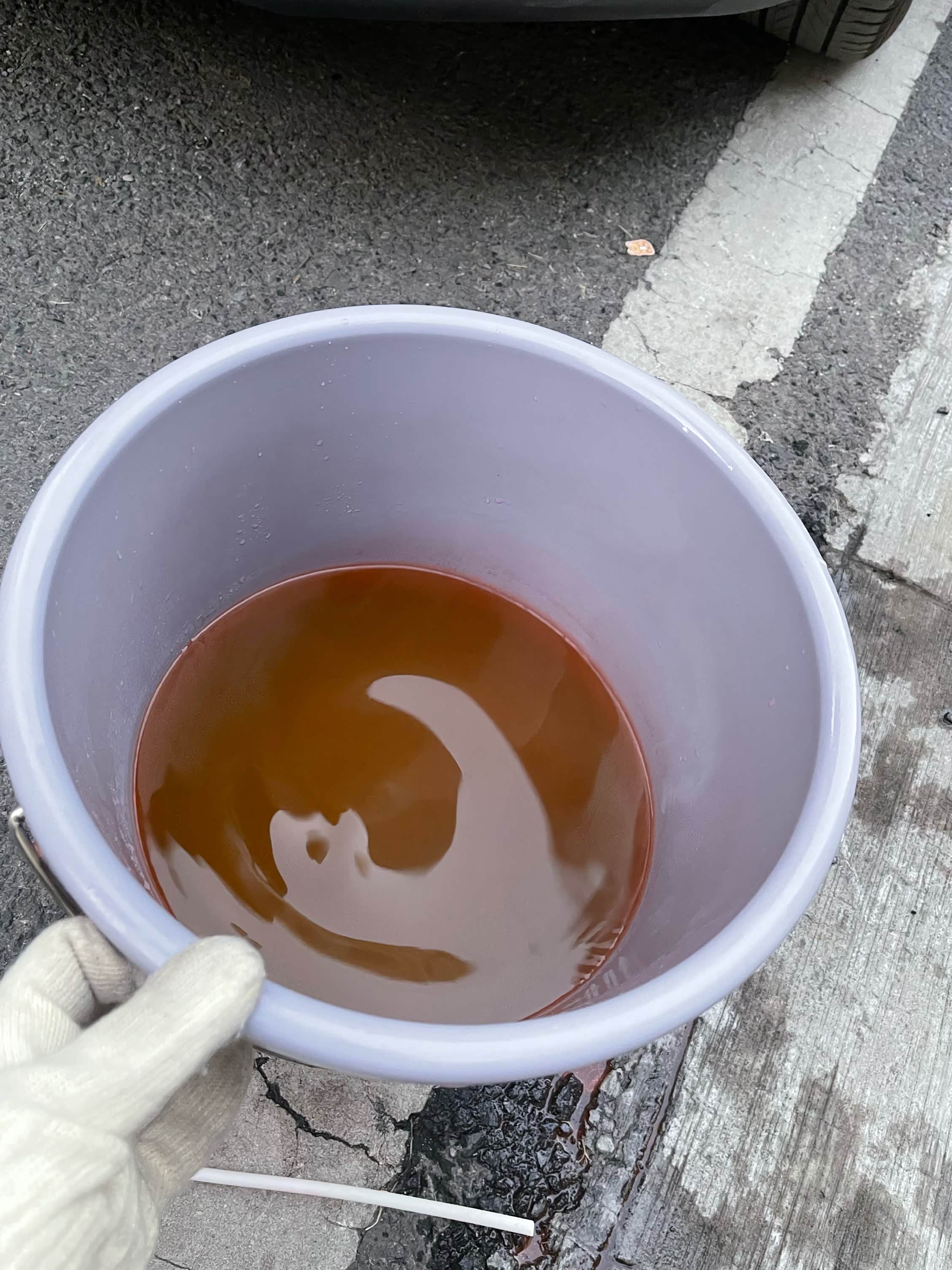 ❸下车开始排废液,水管接到一个桶里,防冻液自然而然就流出来了,颜色其实有点脏的,是有点灰灰的感觉。原车是绿色的防冻液。