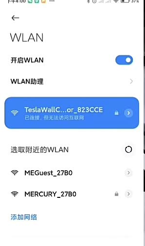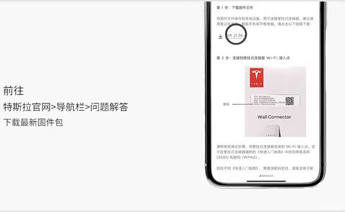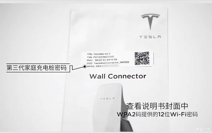 在手机 WiFi 中找到并连接特斯拉充电桩,初始密码在充电桩包装说明书里,WPA2后面的12位字母就是密码。