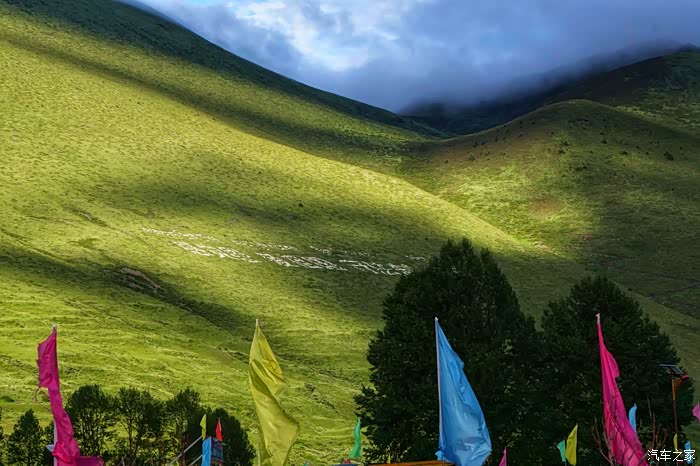 已经是晚上七点多钟了,我们还没到达 新都桥 ,距离 新都桥 还有二三十公里的地方吧,有一片黄绿色的草地,阳光照射下来特别的美
