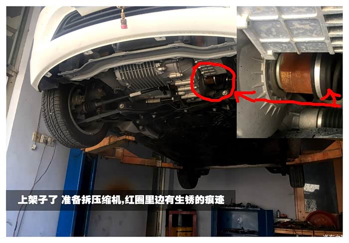 在9月10号接到卖车销售的电话让过去换压缩机,我说没坏呀好好的,但销售经理还是坚持要换好吧那就去。换的时间大约在1一个半小时左右,拆压缩机比安装容易点 ,试了一下空调还是贼凉,拆压缩机的时候看了一下底盘局部有生锈迹象电机裸露所以又在某宝定了原厂护板镀锌的3MM厚 。车一直开着已经5000多公里一切正常,小问题也有就是其中一把钥匙失灵了 据说是丢码自己也不懂也没来得及去处理,先用另一把钥匙开着,当时钥匙失灵后直接用机械要是开的车,然后车就报警了,无奈打开机盖拆下电瓶负极才让车不叫唤…… 以上就是5000公里左右的感受希望能帮到大家,因为几万块钱的东西我也不要求那么高一些不起眼的问题也就懒得说了 这个价位要求高了不现实。(上边说的这些配图都在下边往下看就有)