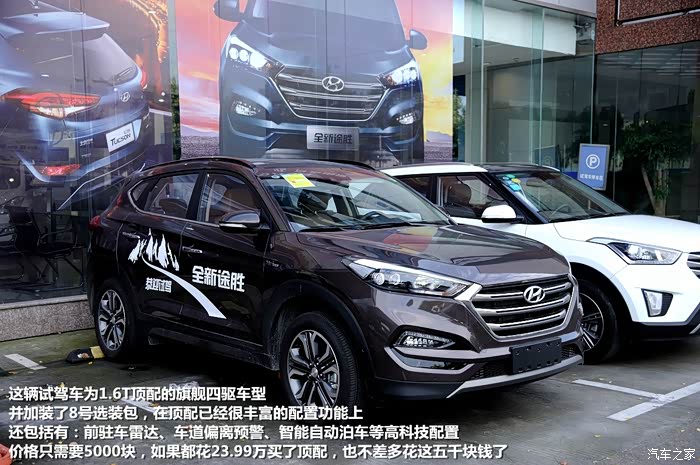 这次试驾体验的车型为全新途胜的1.6T顶配车型:旗舰双离合四驱版,并且加装了价值5000元的8号选装包,包括:前驻车雷达、LDWS车道偏离告警系统、SPAS智能泊车辅助系统,所以这辆车已经集合了全新途胜所能实现的全部功能。