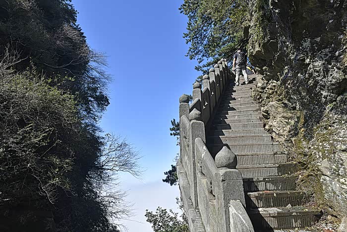 到站,他们选择坐索道,我们三人徒步上金顶。3.5公里,许多很陡的石梯。