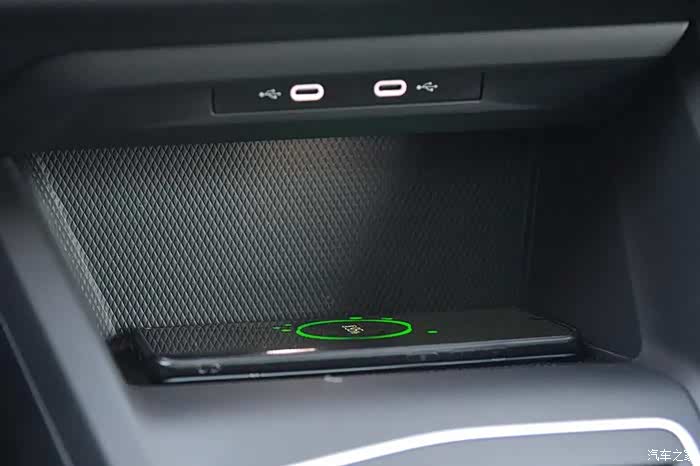 下方的储物格带有两个USB-C插口及无线充电功能。但目前标准USB插头在国内还是比较普遍,USB-C显然是欧洲的使用习惯,这辆车的本地化做得并不友好。