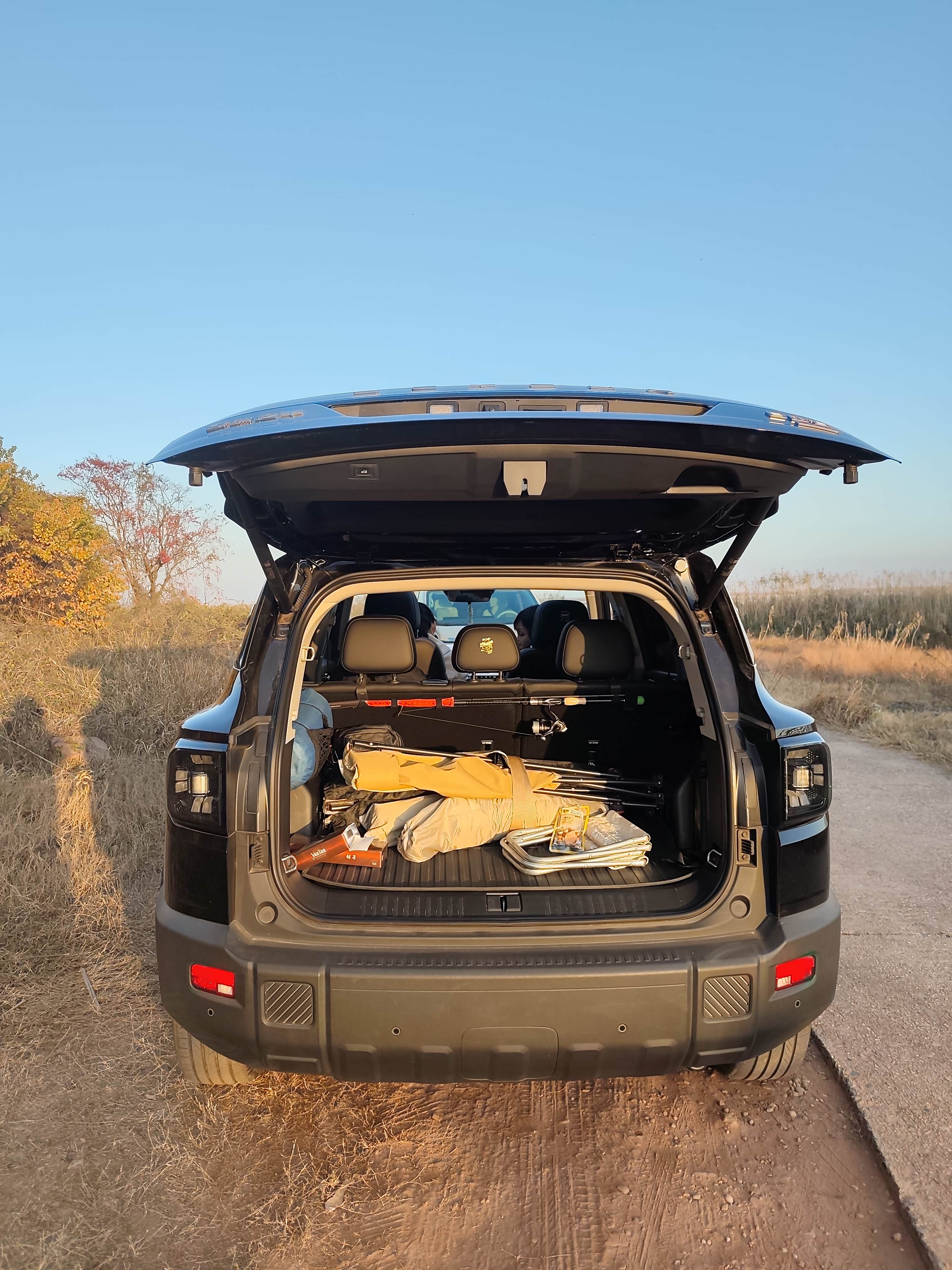 对于钓鱼人而言,空间就是战斗力。这台车的后备箱常规容积达574L,多个钓箱、竿包轻松容纳;将后排座椅放倒后,更能形成纵深近2米、容积超1800L的纯平空间,无论是堆放露营装备,还是等待鱼口时小憩都绰绰有余。长途驱车的舒适度也未曾妥协,高通骁龙8155芯片让车机操作丝滑流畅,15.6英寸中控大屏设置导航一目了然,前排座椅加热功能则在早晚温差大的江边,送来恰到好处的温暖。尽管持续颠簸的碎石路上偶尔会有轻微异响,刹车初段略偏软需要适应,但这些小瑕疵在强大的通过性与实用性面前,早已无足轻重。