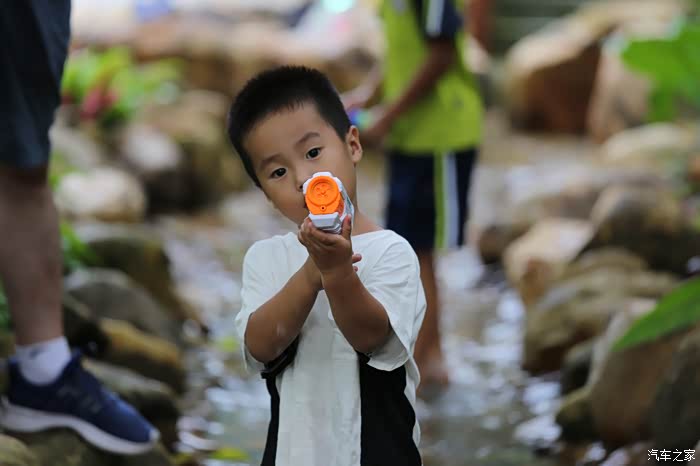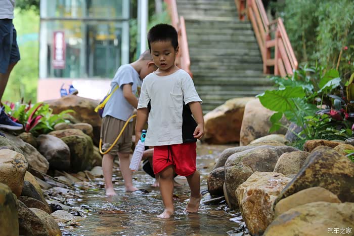 再走下楼梯,就是景区的北门了。这里真是捷径啊,最后再玩玩山泉水就回家吧。这个小人工沟沟里也是铺满了石头,小孩子们开心的玩起了水枪。这里的水也是冰凉剔透。