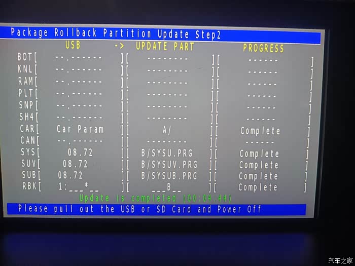 5分钟左右,第二部分刷机成功,拔u盘,熄火