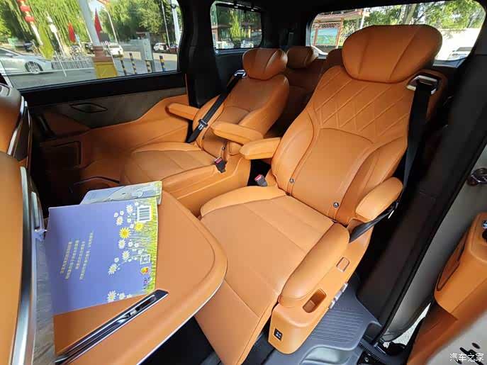二排的沙发座椅,摸着手感软乎乎的。二排车顶配备了娱乐大屏,深受我家孩子的喜爱,因为这里能看他喜欢的动画片。二排还有小桌板可以使用,儿童书和绘本啥的直接放这就能直接看。