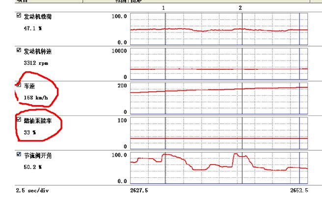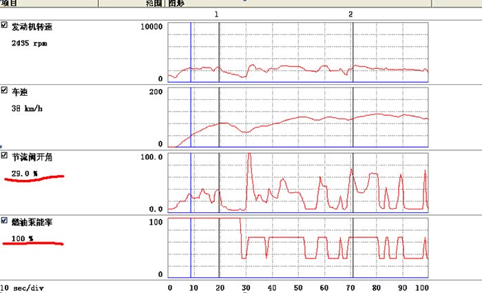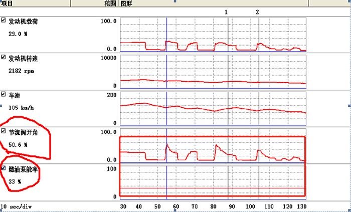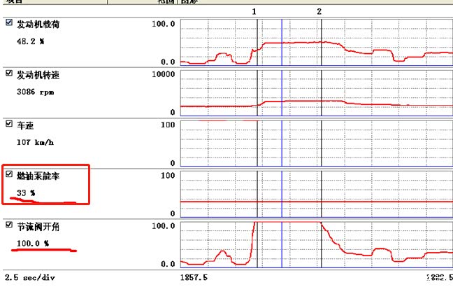 10、搞明白控制方式以后,接下来就开始分析一下试车时的数据,发现在发动机有负荷时,踩油门时,行驶到高速时,燃油泵能率没有变化,一直都是33%,除非猛踩油门,或者一脚踩到家,节流阀开度达到100%时,燃油泵能率才能达到100%或者67%,也就持续一会,平常都是33%,燃油泵的能率不随着负荷的加大而增加,下面几个是试车时负荷加大时的数据。