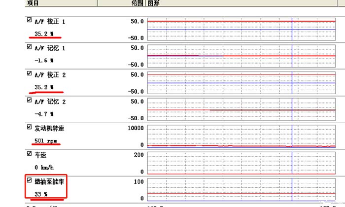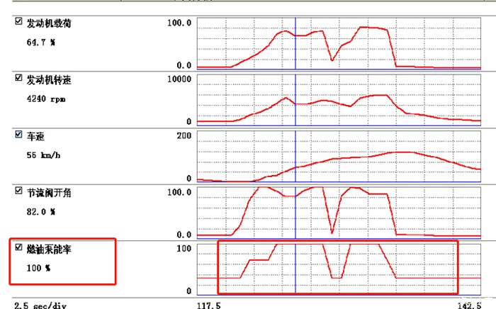 从数据上看燃油泵能率是随着负荷的加大而随之变化的,从而印证了我的推断,当然了那几辆车升完级后再也没犯故障,到此,故障全部解决完毕。