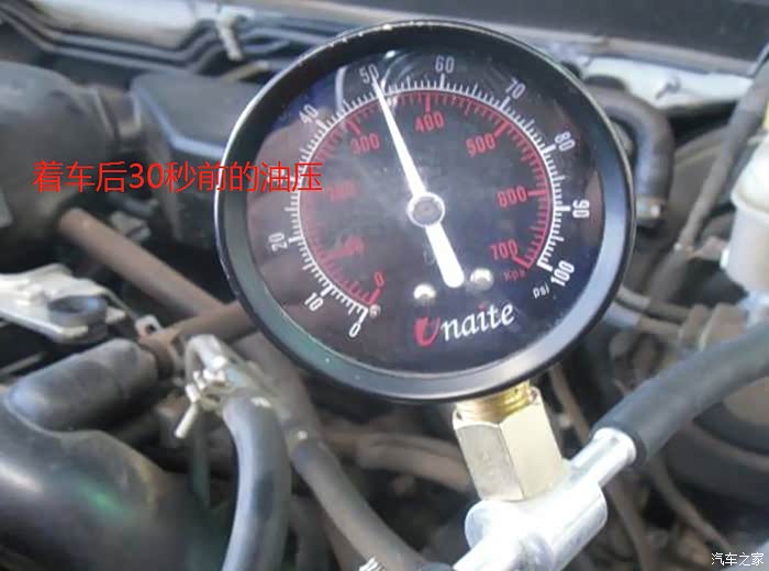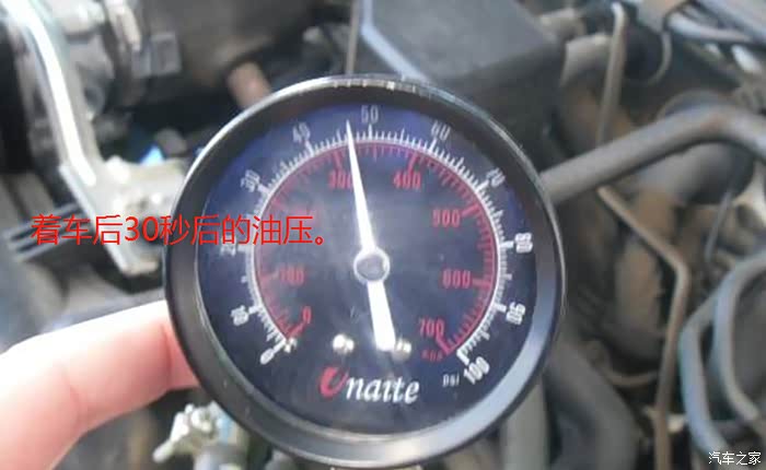 实际测量和标准差不多,不过有一个这样的现象,当刚一打着车30秒内油泵压力是50Psi,着完车30秒后油压变成46Psi了,下面第一张是着车后30秒前的油压,第二张是着车后30秒后的油压。