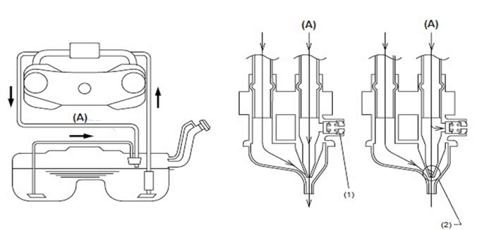 副油箱的油是靠喷射泵利用燃油从发动机返回的速度来产生真空度,然后 利用回油时真空度产生的抽吸效果,喷射泵将燃油箱辅助油室和主油室的燃油转移到燃油泵, 当回油管路喷嘴堵塞时,燃油经安全阀通过回油管路流回燃油箱。如下图所示