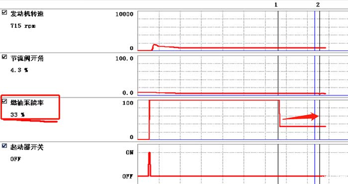 3、从检测仪上面的数据看,每次着车后30秒燃油泵能率是100%,30秒后燃油泵能率就变成33%了,下面是两个数据的对比,注意记号之间。
