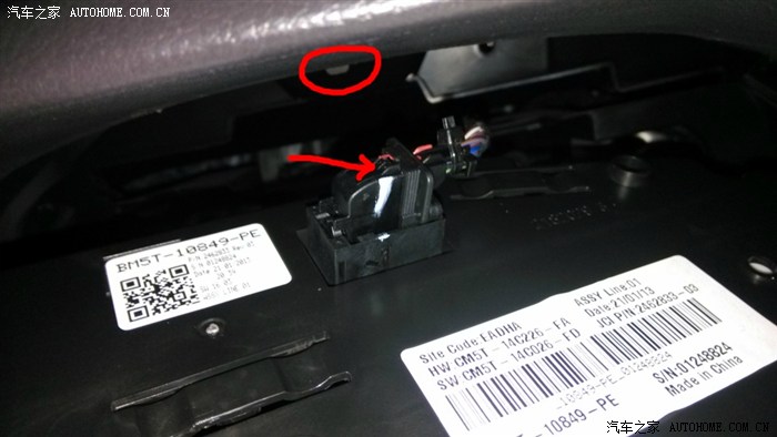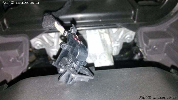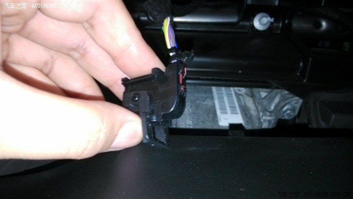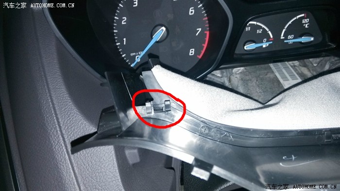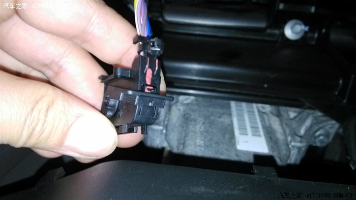 拆掉两颗螺丝,仪表就能拿下来了。往外拿仪表的时候,能听到“咔”、“咔”的声音,不要怕,不是卡扣碎了,而是仪表上面的操作台上有个金属的卡簧,和仪表卡扣脱离时候发出的声音,卡簧位置在下图圆圈处。仪表拿出来之后就能看到仪表后面的插头了,这个插头设计的挺有意思,下图箭头指向处有一个很小的卡扣,卡住立起来的那个卡子,用指甲向下按那个卡扣,卡子就可以拿起来了,向外拔插头,卡子自然就会反过来,插头就和仪表脱离开了。
