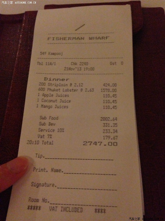 事实上,我们选择是正确的!有情调,有感觉,景美,味美...一份牛排,二份龙虾,三杯饮料,共计2747泰铢也很完美,签单感觉更完美(酒店餐厅等很多都能签单的)小费放了20泰铢...