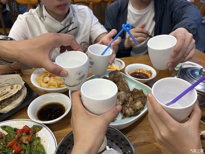 晚上一起举杯庆祝一下,我们到达西安,吃了凉皮,油泼辣子,bangbang面也吃了。