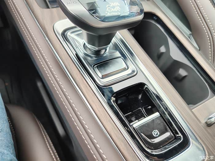 不过新车难免有点味道。我这鸣沙流金内饰,看着庄重沉稳,是那种近似棕灰色,顶棚也是暗色系。而且用了不少翻毛皮材质,光线反射不强,再加上后门车窗是隐私玻璃,这么多因素加起来,车内光线就比较暗。在车库的时候,就算把全车阅读灯都打开,也没觉得多亮堂。
