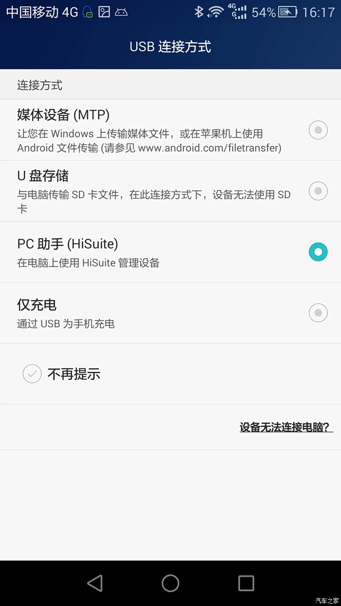 华为的PC助手也下了,但我的USB链接方式选择页面跟你不一样啊,没有你选的那项是怎么回事啊?