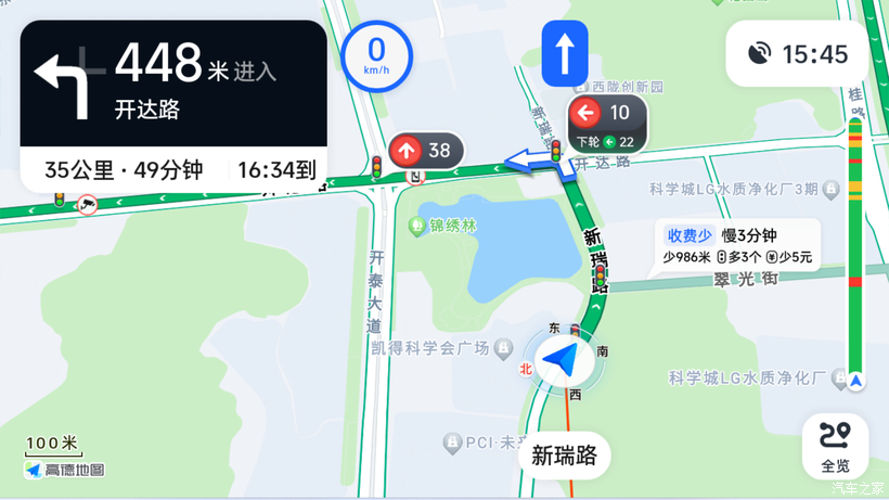 3、巡航时,虽然可以看到红绿灯,并且是左转、直行、右转的读秒分别显示的,但并不是所有红绿灯都能正常显示。